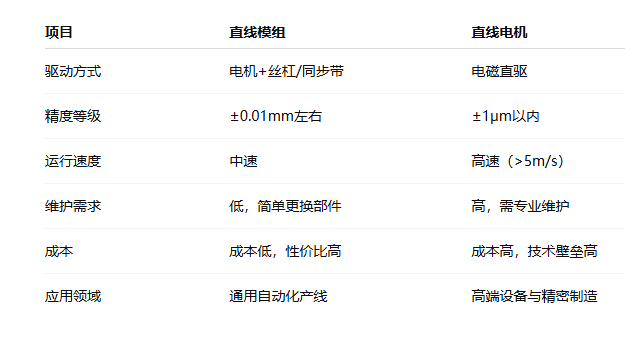 相比之下,直线电机虽然具备高性能优势,但系统构成复杂,需配合高性能驱动器、编码器、冷却系统等,整体投入成本更高,且对技术储备和调试能力要求更高。