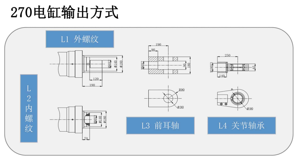 为降低设备集成难度,270 系列在安装与输出形式上提供了多种选择。支持 D1、D2、D5 等常见安装方式,输出形式涵盖 L1、L2、L3、L4,可根据设备结构和受力方式灵活匹配。通过在选型阶段合理确定安装与输出形式,有助于减少偏载和附加应力,对延长电动缸使用寿命具有实际意义。