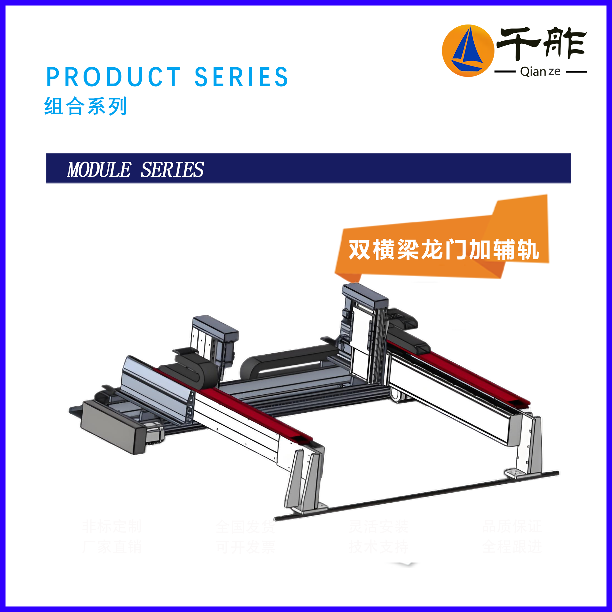 千舴传动双横梁龙门加辅轨是在传统双横梁龙门结构基础上增设辅助导轨的强化设计,主要针对超大型、超长跨距或超高精度加工场景。辅轨通常沿主横梁两侧或底部对称分布,形成复合导轨系统,可大幅提升设备刚性及抗偏载能力。
